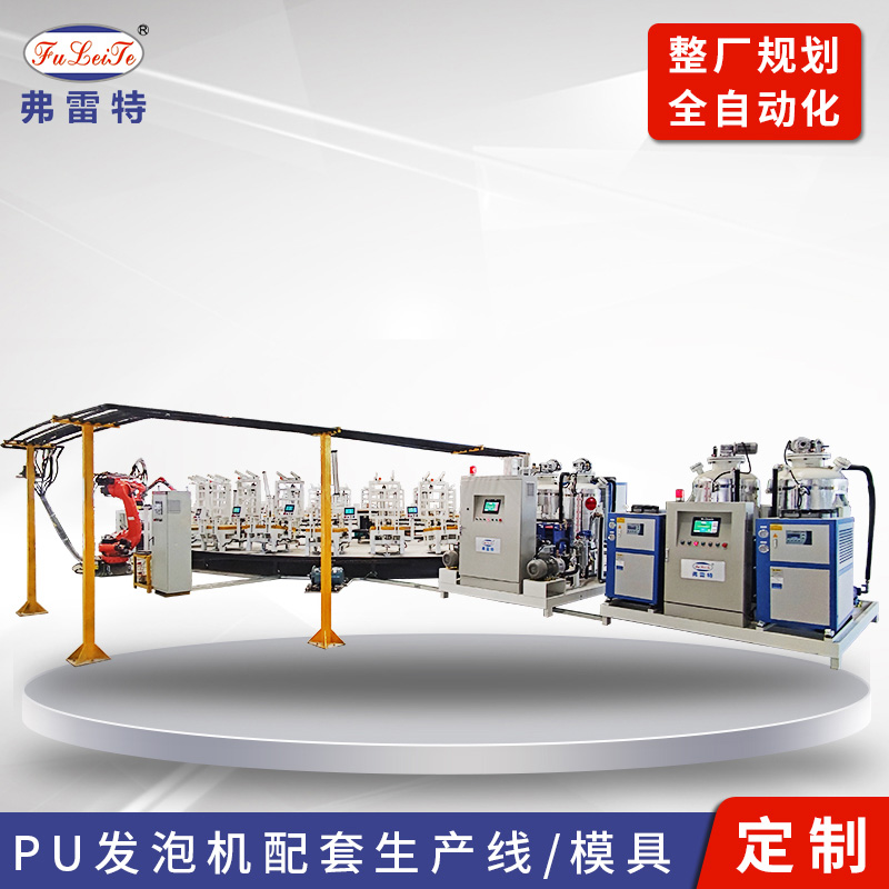 整條生產(chǎn)線只需要二人就可完成生產(chǎn),一天24小時產(chǎn)能大于等于5000個產(chǎn)品,主要由上位工控機(jī)、掃碼讀碼系統(tǒng)、FLT-ZD/S型全自動控制模具模架、德國庫卡機(jī)器人、FLT-12G可變比例的聚氨酯高壓發(fā)泡機(jī)、FLT-12M預(yù)混站、FLT-ZK-PP/T真空破泡機(jī)等主要設(shè)備組成: