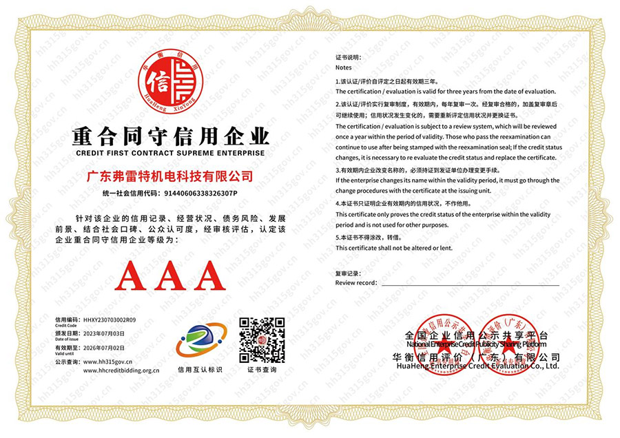 廣東弗雷特機電科技有限公司能獲此殊榮乃屬實至名歸。公司自成立伊始,始終秉持“以人為本,用戶至上,誠信經營,合作雙贏”的經營理念,嚴格認真、誠實信用地強化經營管理。對客戶,公司建立健全了合同管理的一系列制度,加強合同的管理,保證合同的如期履行。在合同的訂立、履行、變更、終止等活動中,以法律法規(guī)為準繩,以行業(yè)標準為依據,從而增強了履行合同的有效性。對員工,公司都依法簽訂了勞動合同,并每月按時支付員工工資,無拖欠員工工資現(xiàn)象的發(fā)生,公司內部無重大質量、安全事故,公司以人性化的管理從而營造了良好的工作氛圍。 公司經濟實力強,經濟狀況良好,也為合同的履行打下了堅實的基礎。