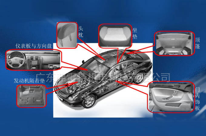 典型產品:汽車中的遮陽板、內飾門板表皮襯墊、密封墊及條、頂棚內襯、地毯背襯、座椅坐墊、靠背、頭枕。