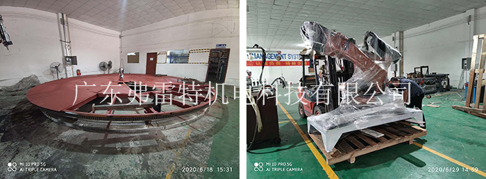 功能:通過7.6米的大型轉盤對12套模架進行固定,360°自動旋轉配合脫模機機器人、注料機器人、聚氨酯發泡機等設備工作,以達到運動狀態下進行產品的自動化生產,提高產能。