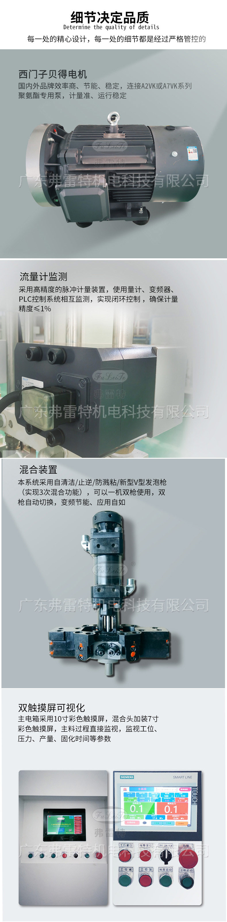4、混合裝置:采用自清潔/止逆/防濺粘/新型V型(實現3次混合功能)發泡槍,結構美觀,操作方便。配合西門子聚氨酯專用泵,注射準確,混合效果好。