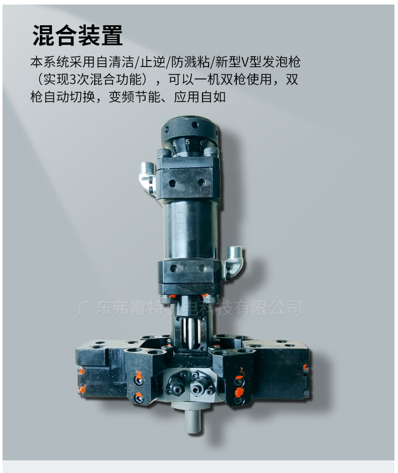 混合裝置:本系統采用自清潔/止逆/防濺粘/新型V型(實現3次混合功能)發泡槍,結構美觀、操作方便。配合西門子聚氨酯專用泵,注射準,混合效果很好。