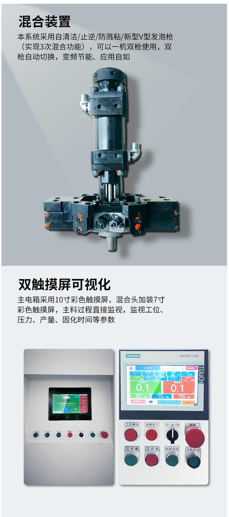 4、混合裝置: 采用自清潔/止逆/防濺粘/新型V型(實現3次混合功能)發泡槍,結構美觀,操作方便。配合西門子聚氣醋專用泵,注射準確,混合效果好。