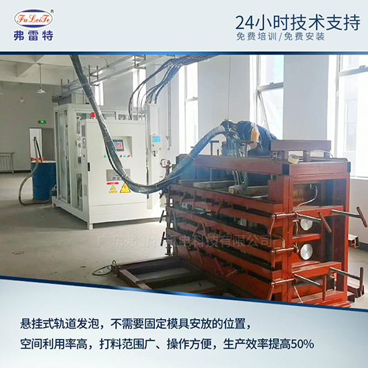 3、懸掛線比傳統(tǒng)擺管式更實(shí)用:打料范圍廣、可以選擇不同大小模具操作、定位工位可操控,可以滿足冰箱、消毒柜、保溫箱等大型發(fā)泡產(chǎn)品批量生產(chǎn)。
