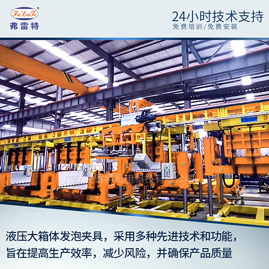 通過在發(fā)泡機上設置可讀取箱體條碼并與發(fā)泡機設定型號進行匹配的傳感器,使上箱平臺上的預裝箱體依次與至少一個發(fā)泡機進行匹配直至在相匹配的發(fā)泡機上進行發(fā)泡,以完成同一生產(chǎn)線上進行多種規(guī)格的發(fā)泡。 該發(fā)泡線采用直線式布局,夾具各模板采用水加熱方式。夾具具有自動堵泡和自動抽芯功能,換模采用氣缸或人工驅(qū)動連桿機構(gòu),有人工控制和電氣控制雙重自鎖功能。、適用于不同長、寬、高的箱體生產(chǎn)。生產(chǎn)線具有外形美觀大方、結(jié)構(gòu)緊湊、環(huán)境污染少、勞動強度小、占地小、功能強、生產(chǎn)效率高、多品種柔性生產(chǎn)等特點。