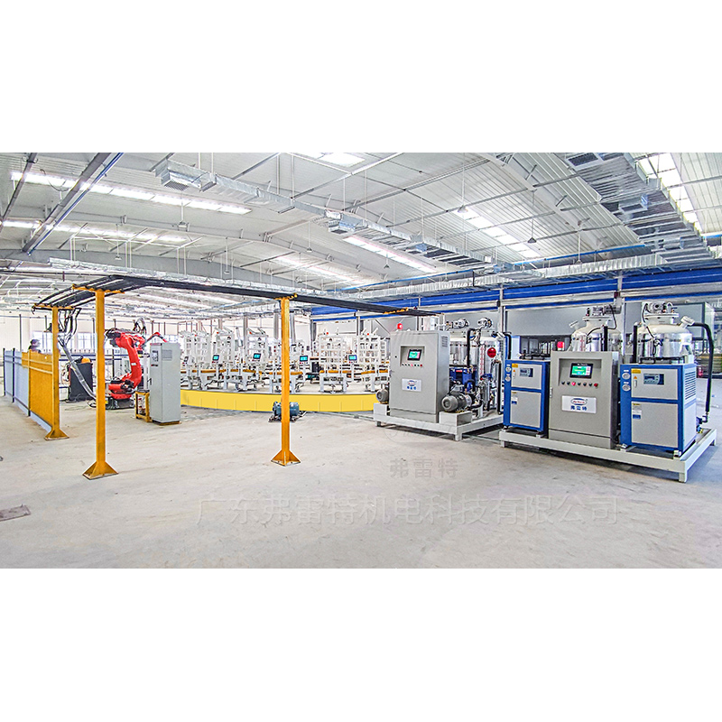 發泡線配備1套高壓發泡機和預混站,2臺KUKA機器人,完成注料脫模作業,主線采用轉盤式布局,可單次裝載30套發泡模具,模具具備二維碼識別自動開模功能,實現快速裝卸切換。