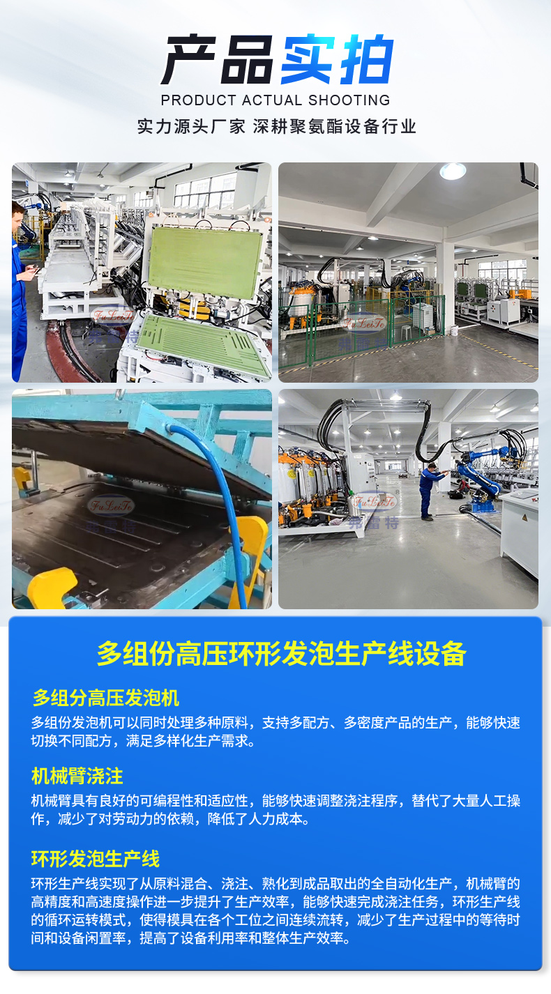這套設備采用弗雷特研發的機械臂自動化澆注,操作更為簡單,性價比高;自動機械臂搭配弗雷特聚氨酯高壓發泡機,高壓槍頭自動澆注,氣動模架自動開合,節省人力,操作更為方便。整套發泡生產線由弗雷特制造,我們致力于為客戶提供完整的聚氨酯設備配套方案。多組份聚氨酯高壓發泡機參數