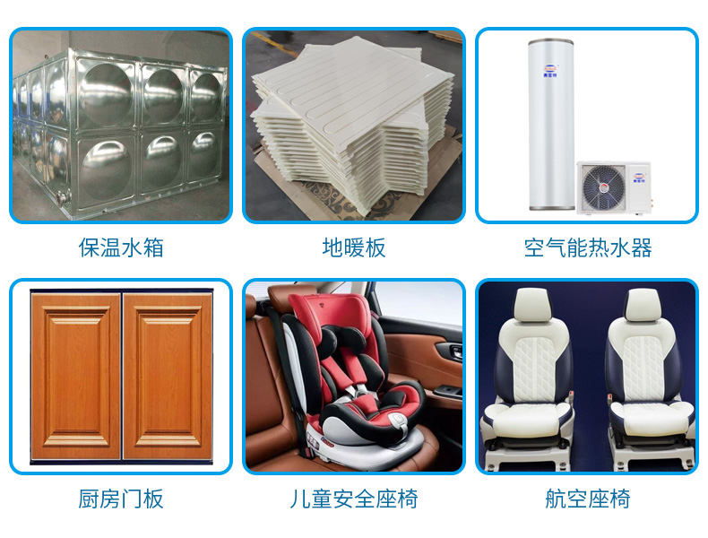 應用于高回彈、慢回彈、PU自結皮(汽車摩托車坐墊,枕頭,方向盤,扶手,健身器材防護件,醫療器械配件等)、硬質PU發泡等(建筑板材,電熱水器,保溫水箱板,小冰箱等填充保溫材料)。
