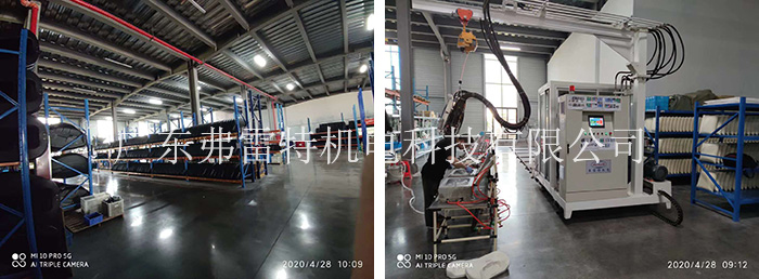 干部設備主要由模架車、閉模器、液電氣控制系統組成;濕部設備主要有高壓發泡機、計量系統、液壓站等。橢圓環形線具有工位多、換模節拍短等優點,目前座椅發泡工廠多采用環形生產線。